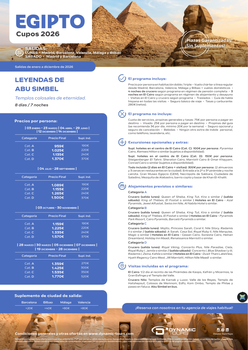 EGIPTO 【Leyendas de Abu Simbel】『4cru+3cai』(✈ Madrid, Barcelona, Valencia, Málaga y Bilbao) desde 959€