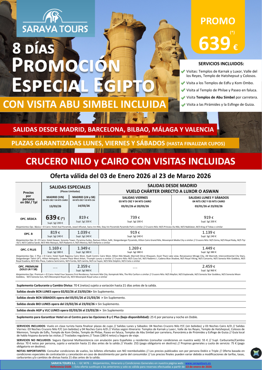 Promo Egipto con Abu Simbel 8días. *Salidas Mad, Bcn, Bio, Agp & Vlc* Crucero y Cairo desde 599 € hasta Dec26